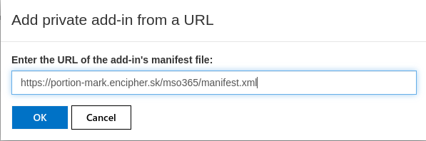 Copy and Paste or type the following URL in the resulting Add Private add-in from a URL pop-up box: https://portion-mark.encipher.sk/mso365/manifest.xml so that it resembles this