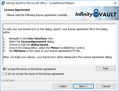 If you agree with the terms, select the "I accept the terms in the license agreement" radio button and then click Next > to move to the next step of verifying that you wish to install Infinity Vault.