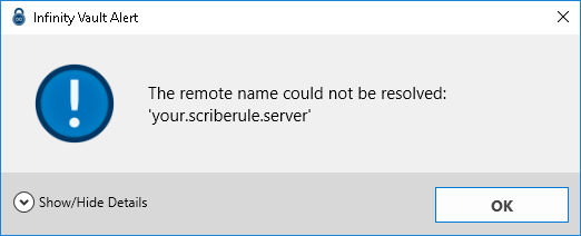 The selected Infinity Vault server is unreachable or has been incorrectly configured. Please verify your Infinity Vault Server settings.