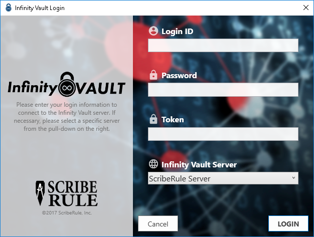You will need to enter your Login Id, Password, and Token. These will obtained as described by your System Administrator and may be specific to your installation. You will also need to select the desired Infinity Vault Server, if you have more than one.