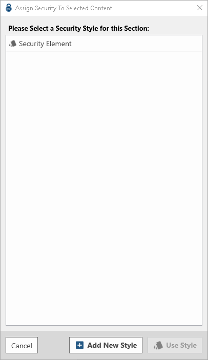 Begin by highlighting the text you wish to apply a new Security Style to, and click to open the Assign Security to Selected Content dialog.