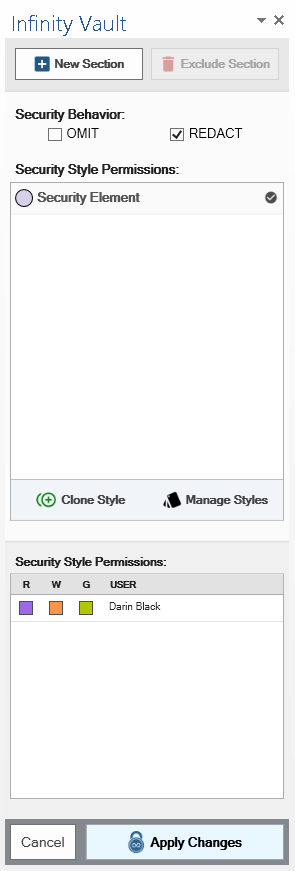 You should now understand the two modes of editing in Infinity Vault for Office: Content Mode and Security Edit Mode. You should also understand the options available to you in the Security Editor Sidebar such as creating a New Section, Security Behavior, and the basics of the Security Style Palette.