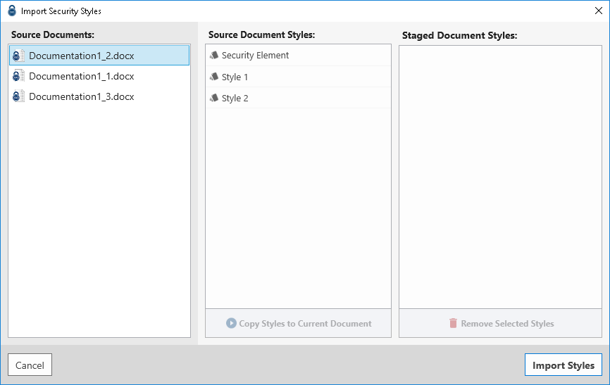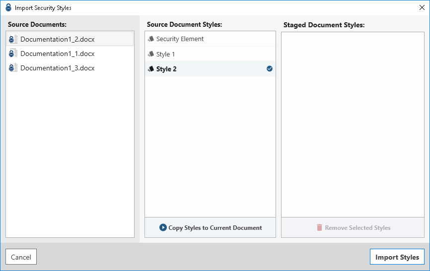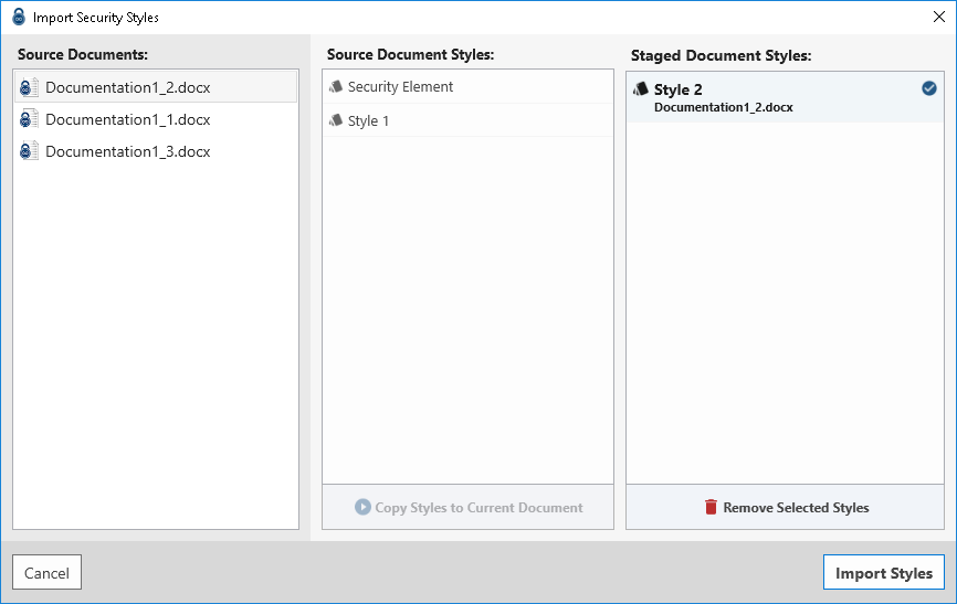 A list of the Security Styles in the selected Source Document is listed in the Source Document Styles column.